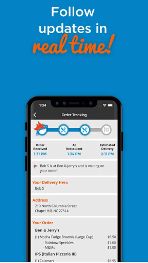 Once your order is on the way, your app keeps you in the loop. You’ll know the whereabouts and arrival time of your food and can greet it with fork in hand.