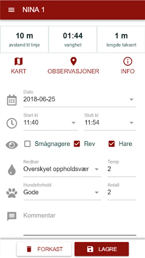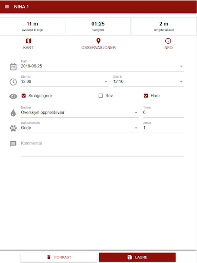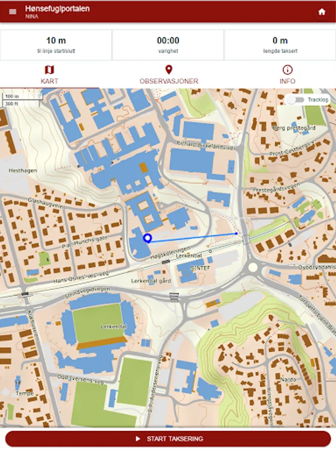 Hønsefuglportalen is developed to make tetraonid line transect surveys and data entry directly to the server easier and less error-prone. Users that are registered in Hønsefuglportalen will get access to their survey lines when they log in with the mobile app. When they start their line transect surveys, the correct transect line is selected and the survey can be initiated. While surveying, the mobile app will directly keep track of duration, distance to the transect line, and total distance surveyed. When an observation of a tetraonid bird, the observation can easily be registered. Species and number of birds in the cluster is registered manually, whereas time, GPS location and perpendicular distance to transect line is registered automatically. When the transect survey is completed, all data including the track log will be stored locally on the phone and transferred to Hønsefuglportalen when the user is online.