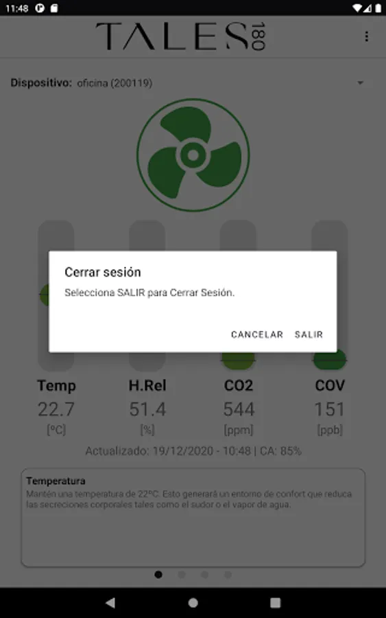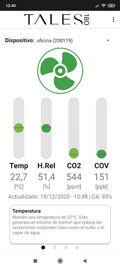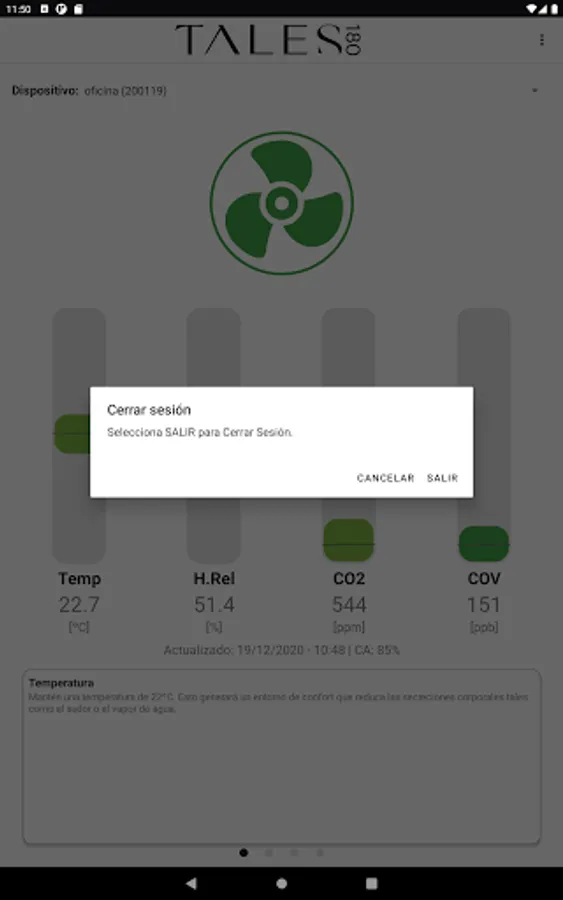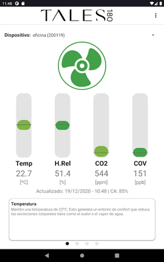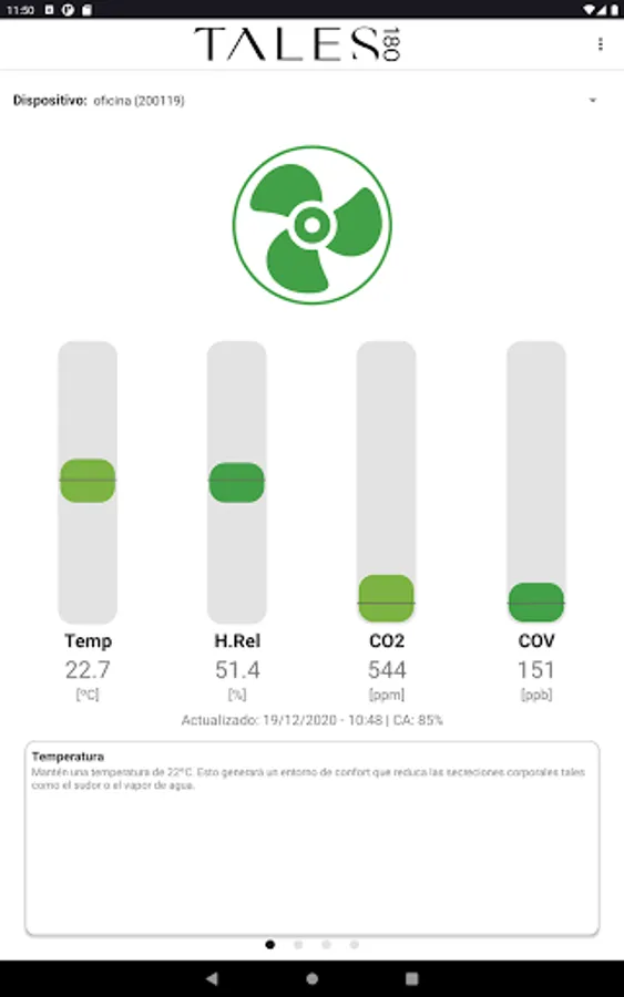 Analyze in real time and remotely, the air quality in the surroundings near Tales Technology. Receive notifications when it is advisable to ventilate the space where Tales Technology is present. Receive notifications when Air Quality could be harmful and promote the transmission of diseases by air.