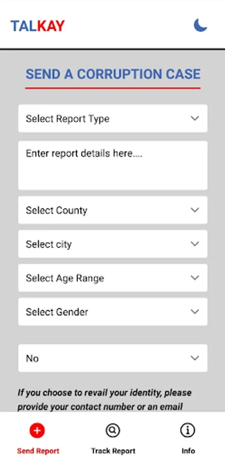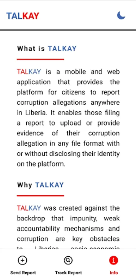 TALKAY is a mobile and web application that provides the platform for citizens to report corruption allegations anywhere in Liberia. It enables those filing a report to upload or provide evidence of their corruption allegation in any file format with or without disclosing their identity on the platform.