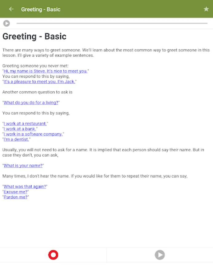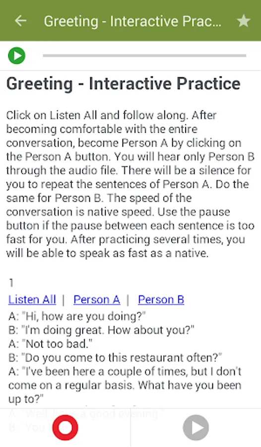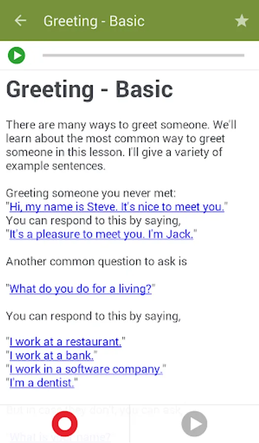 Talk English Standard is the official Free TalkEnglish.com Android App. There are over 900 lessons and 8,000 audio files to help you learn how to speak English fluently. Most lessons contain clickable sentences that you can click to listen to a native English speaker say that sentence. Each lesson page also has a self record tool. You can record your own voice reading that sentence and compare it with the audio file from the native English speaker.