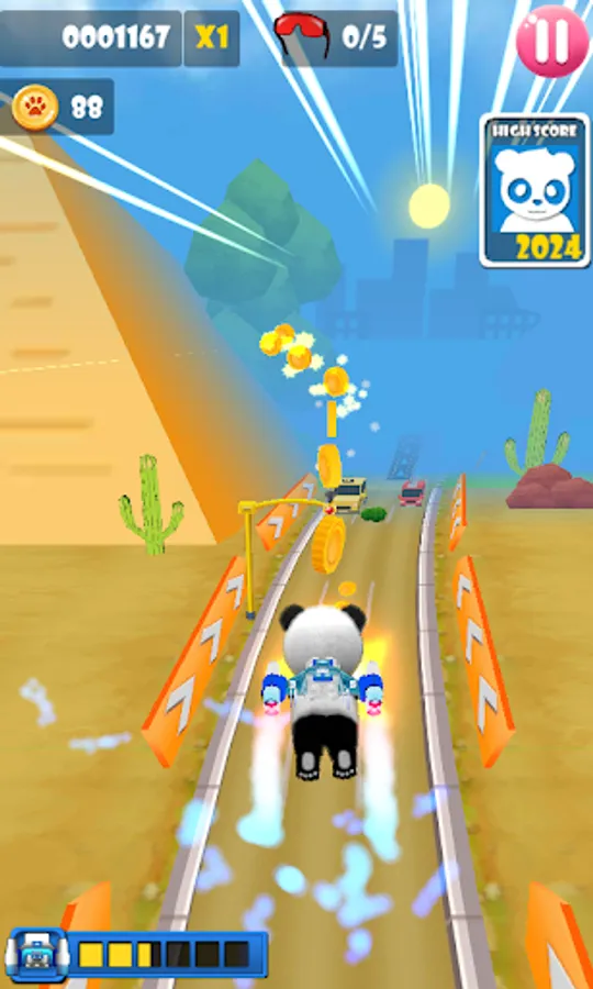 Explore the city and desert. Run, slide and leap your way across the subway and desert! Dash forward as fast as you can, dodge obstacles and collect coins! Take a trip down a jetpack reach mega heights! The city is your panda show, and the obstacles are your agility course!