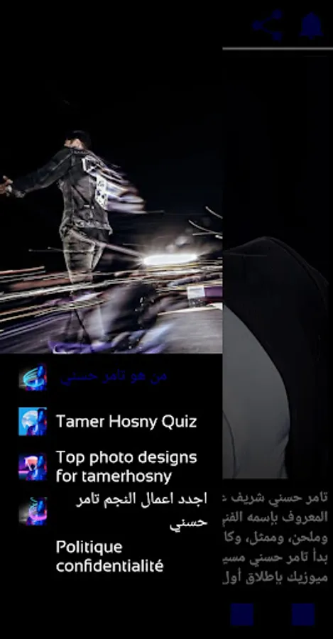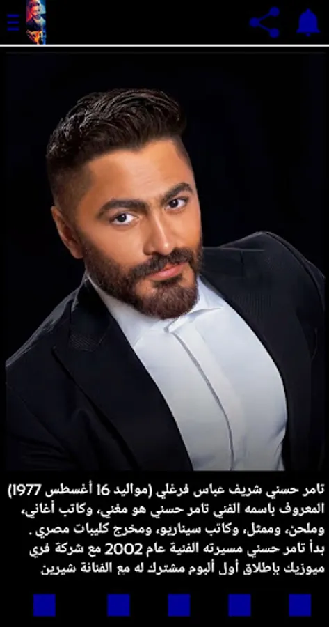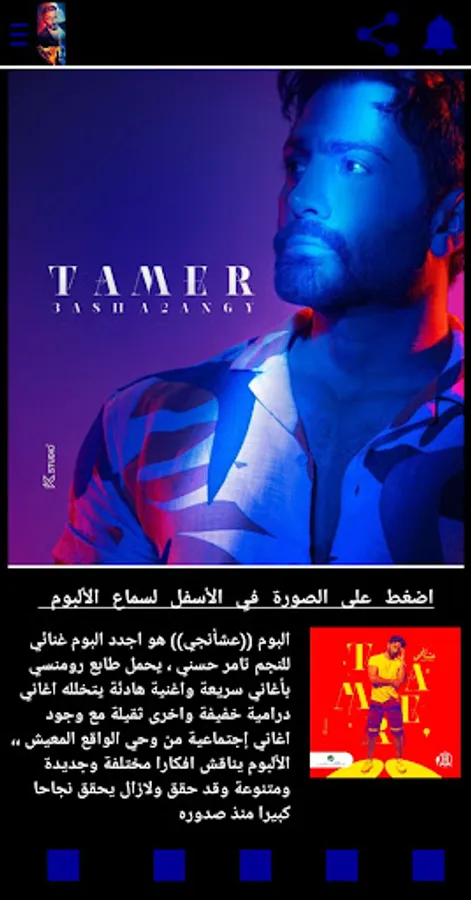 It is an application for the Egyptian Arab star Tamer Hosni that includes questions about his artwork, entertaining and helping the user to know more information about his favorite artist, the application also includes a window displaying the best designs made by fans for their star and also contains a window displaying his latest rich works
