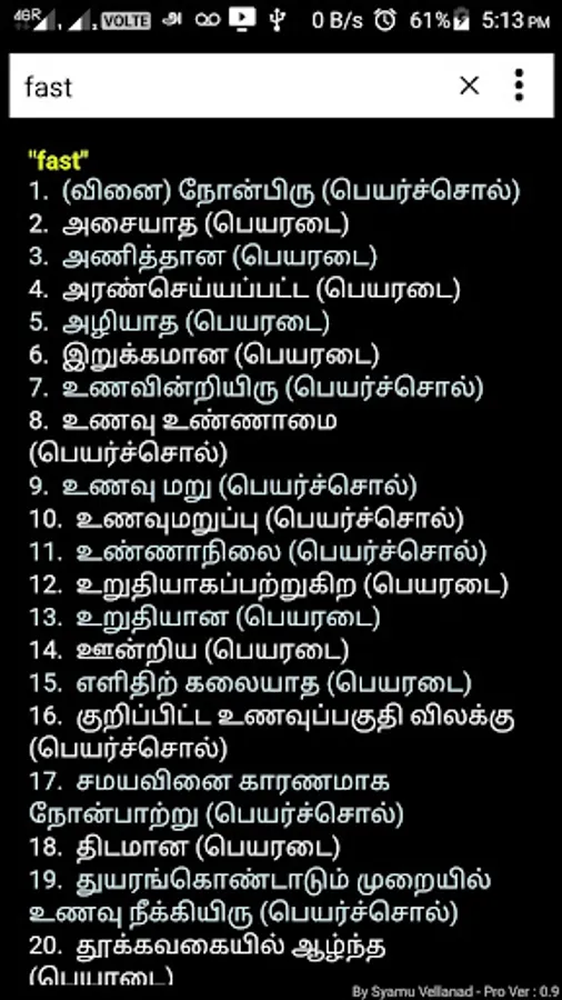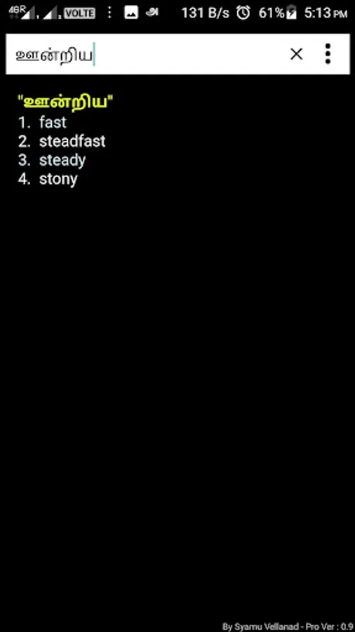 It is a bilingual dictionary with English to Tamil and Tamil to English Meaning. If you are reading EBook/PDF/Internet pages etc and have some doubt with word no need to minimize the thing you are reading. Simply select the word and copy. It will give you the result. It consists more than 12.7 lakh+ results (ML 3 Lakh + ENG 9.7 Lakh). It have most of the words which published by OED(Oxford University Press), Chambers , Collins, Longman, Macmillan and Merriam-Webster's Learner's Dictionary. The light weight version of this dictionary Tamil Dictionary Pro is available which is without English to English Meaning, Synonyms , Antonyms Etc.