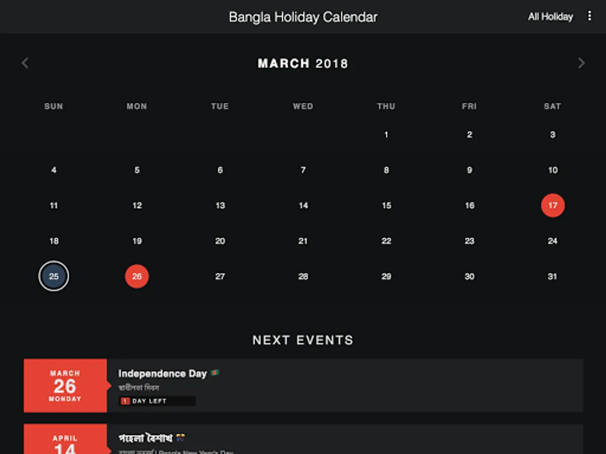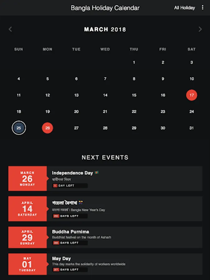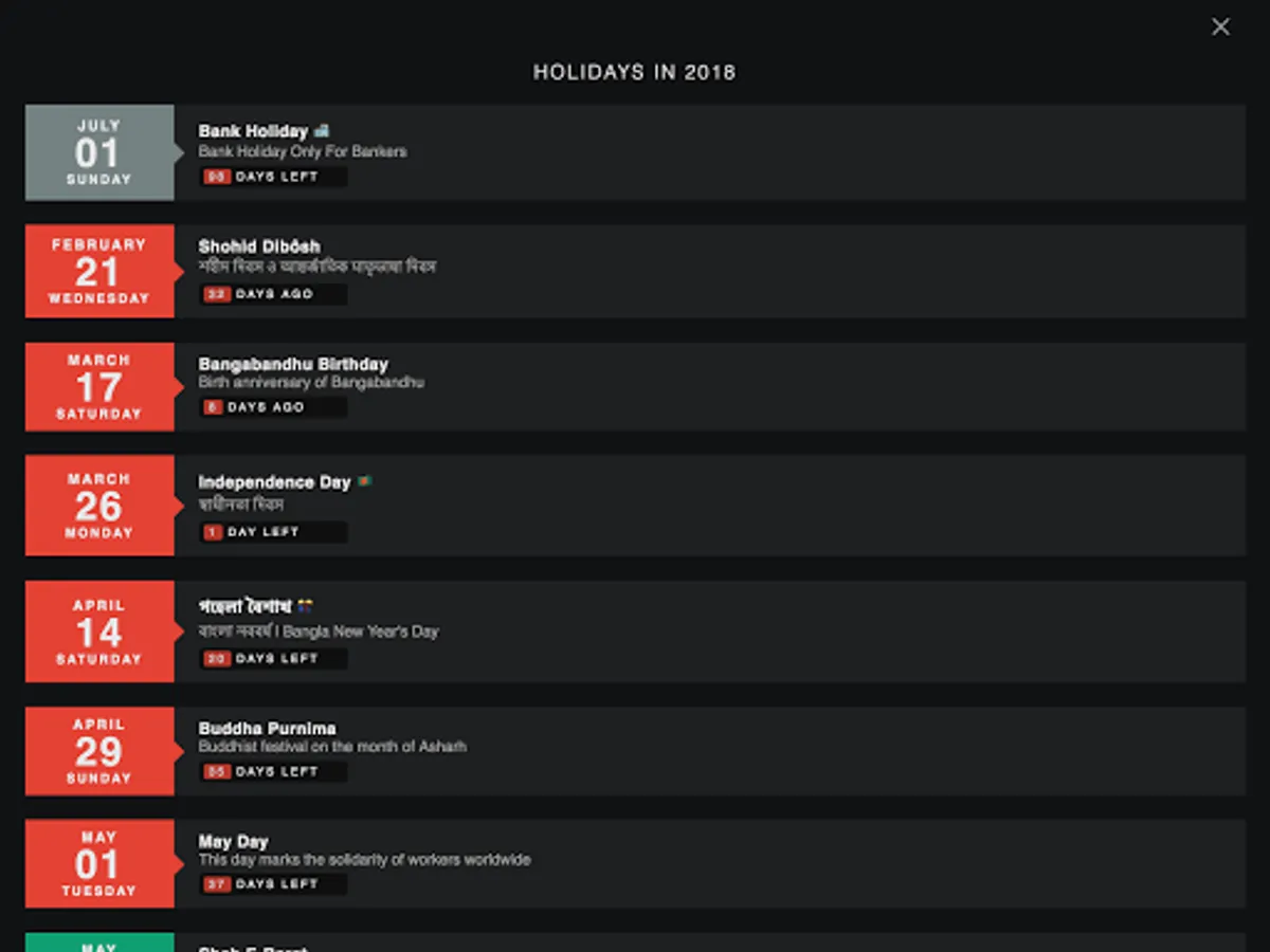 Discover the complete list of Bangladesh public holiday dates for 2023. This app shows you the dates for public holidays such as বাংলা নববর্ষ, ঈদ, দুর্গা পূজা, বড়দিন, and many others. You'll find all of the latest events from our local region also (হরতাল, অবরোধ, বাংলাদেশ ক্রিকেটের ক্রীড়াসূচি সহ গুরুত্বপূর্ণ অন্যান্য sports events).
