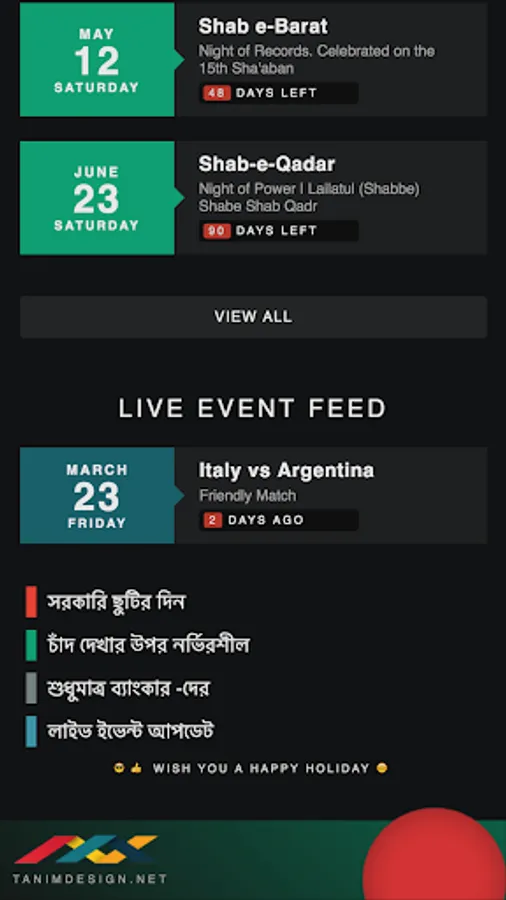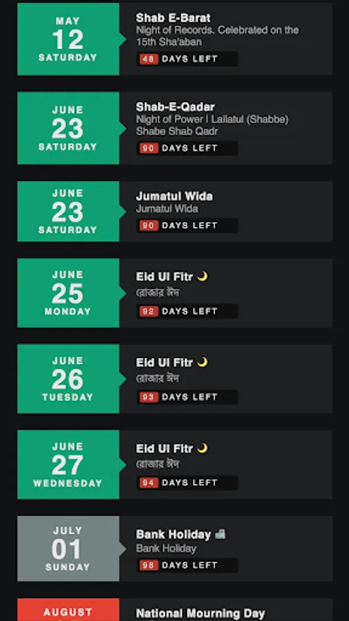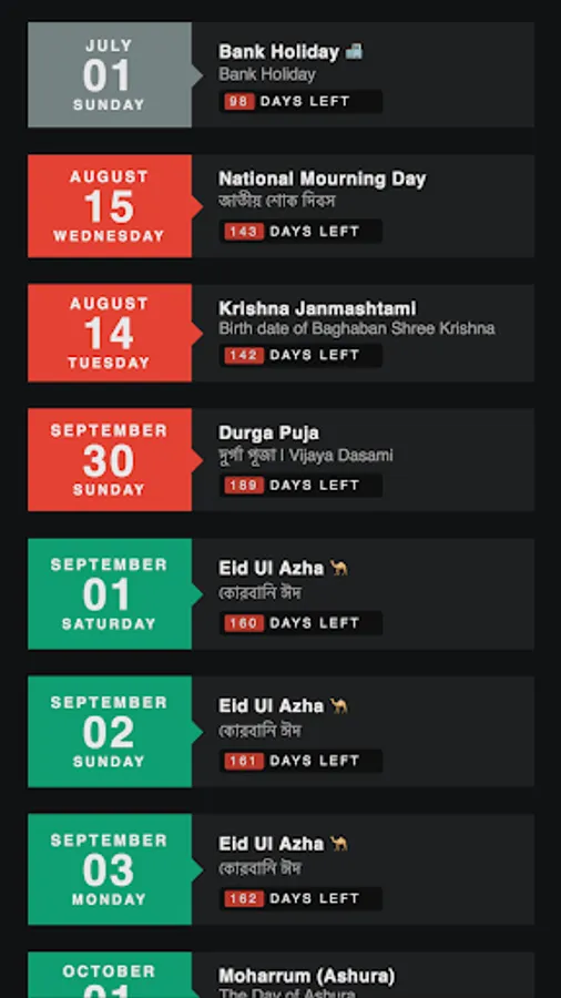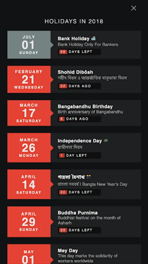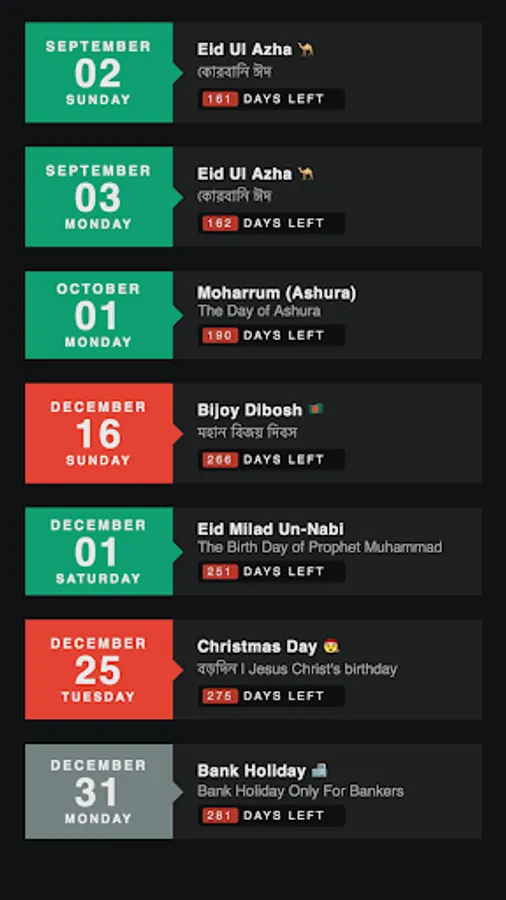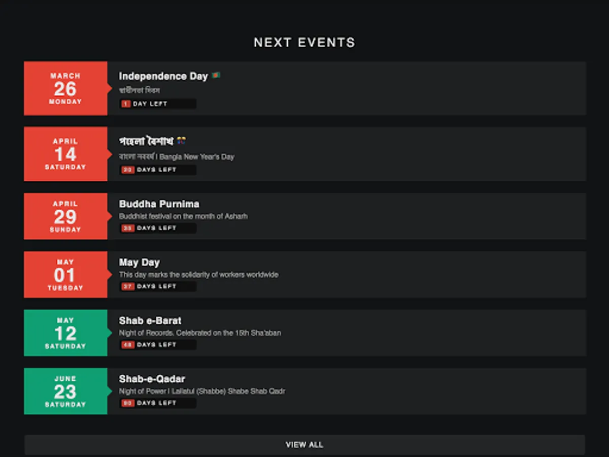 Discover the complete list of Bangladesh public holiday dates for 2023. This app shows you the dates for public holidays such as বাংলা নববর্ষ, ঈদ, দুর্গা পূজা, বড়দিন, and many others. You'll find all of the latest events from our local region also (হরতাল, অবরোধ, বাংলাদেশ ক্রিকেটের ক্রীড়াসূচি সহ গুরুত্বপূর্ণ অন্যান্য sports events).