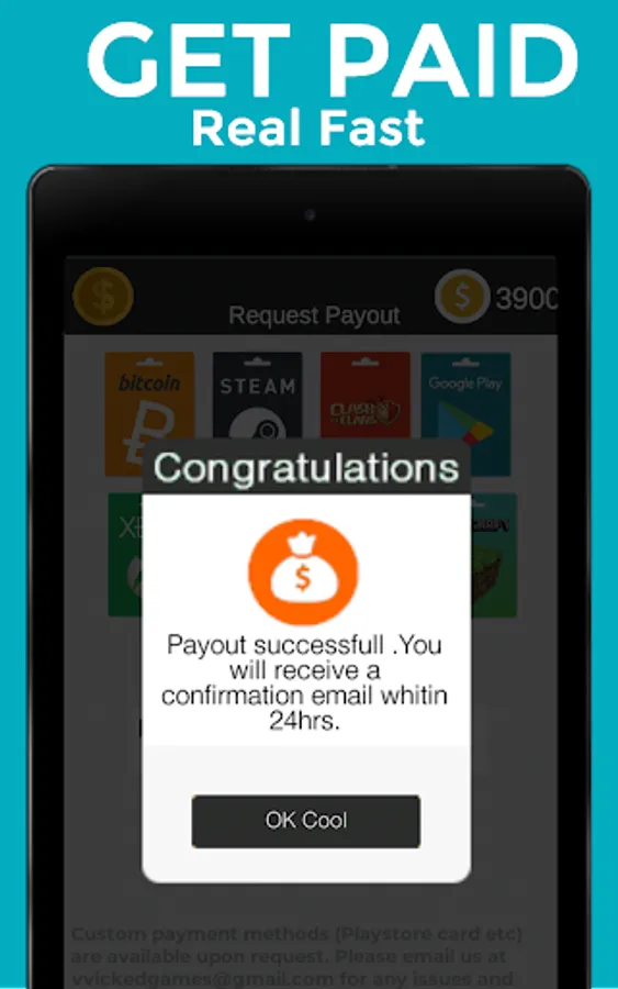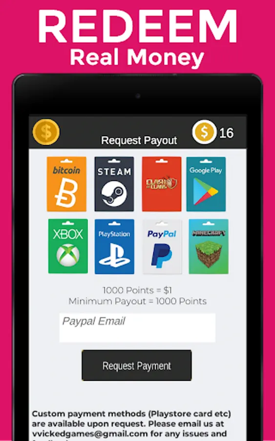 Get fast payments in Paypal , mobile recharge or giftcards.