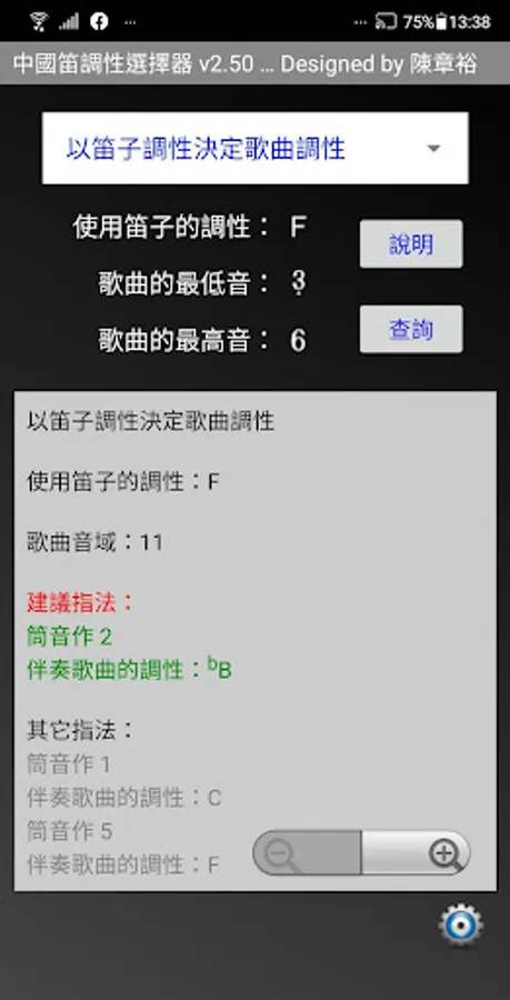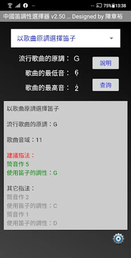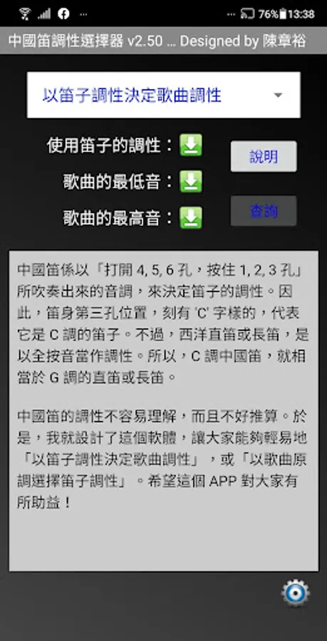 中國笛的調性不容易理解,而且不好推算。於是,我就設計了這個軟體,讓大家能夠輕易地「以笛子調性決定歌曲調性」,或「以歌曲原調選擇笛子調性」。希望這個 APP 對大家有所助益!