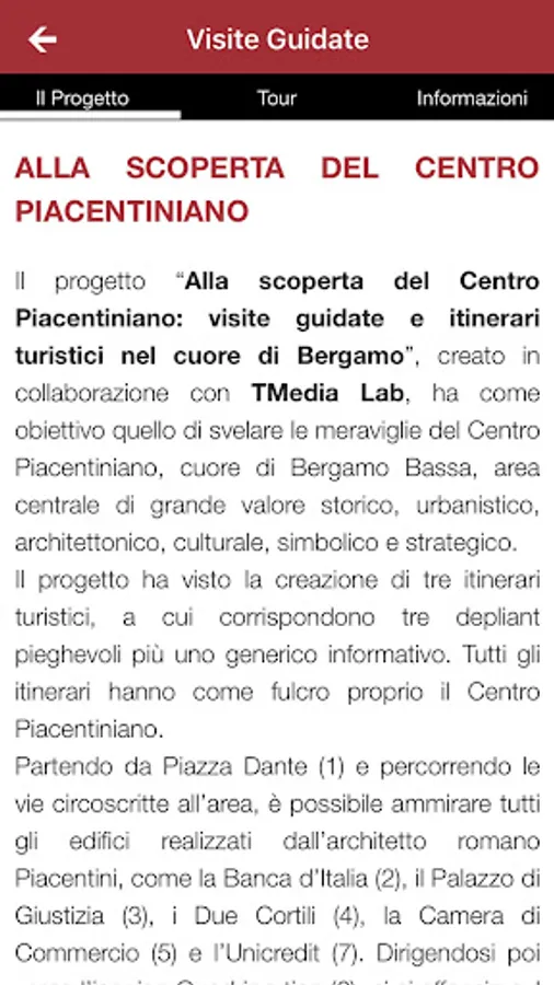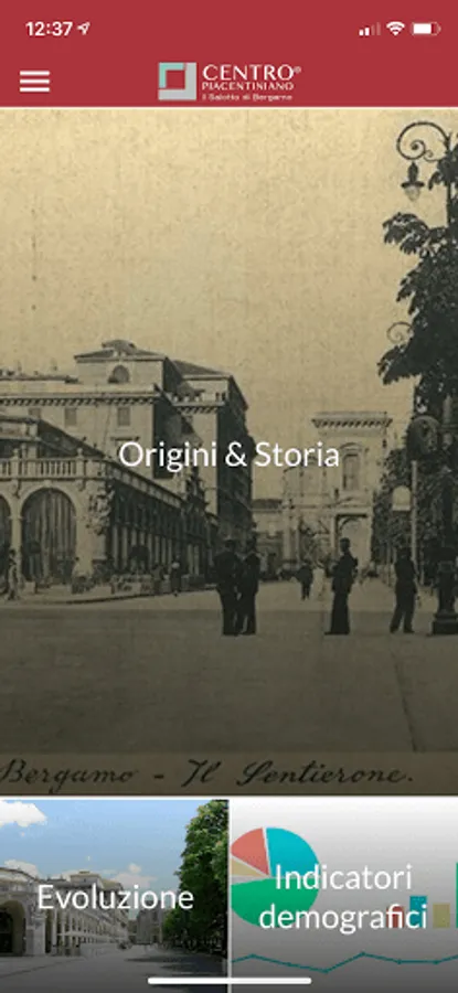 The APP Piacentini Center will be your starting point for discovering one of the loveliest spots in Bergamo. From the Guide to Routes through guidance on What to do, Where to Eat, Where to sleep, the APP Piacentini Center will give you a complete overview, from the birth of the complex called "Piacentini Center" to this day, including shopping and culture.