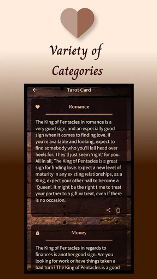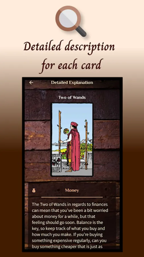 How does it works? The app will pick a card every day and will explain the meaning for you. There will be overall meaning of the card for your life, in Work/ Education, Money or Financial, Spirituality, and of course Romance, or Love. Use our app to get free love tarot reading every day. The free love tarot reading works whether you are single or in a relationship. Aside from the meaning in your life, we will also explain the personality and Eventive meaning of each card.