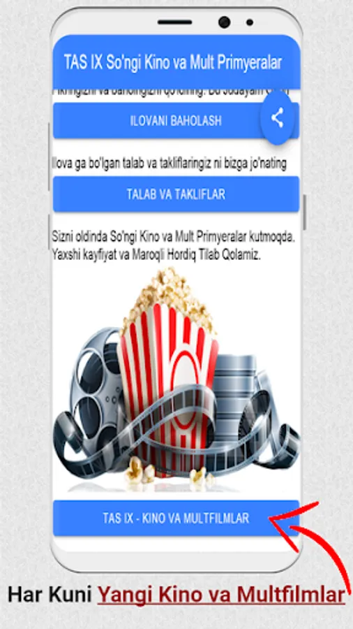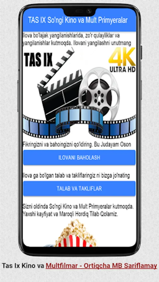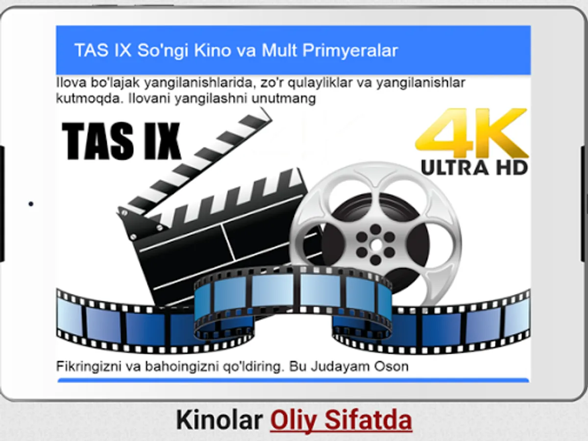 Yangi Kino larni ilova orqali TAS IX da ko'ring. Kundan kunga ilova ni yaxshilab borgan sari siz ga hali bo'lmagan qulaylik va sifatni taqdim etamiz! Ilova endi chiqani sababli qandaydir noqlaychilklar bo'lishi mumkun, lekin tez va sifatli bartaraf qilamiz. Sizning yordamingiz bilan albatta yaxshi bo'lamiz.