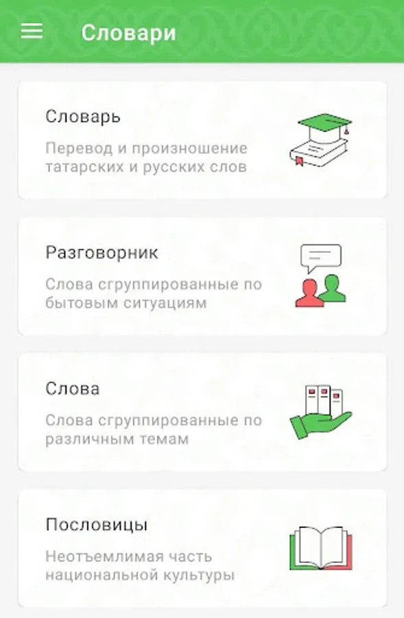 The application contains a Tatar-Russian dictionary, a special study mechanism, study statistics, as well as the ability to communicate with other users of the application.