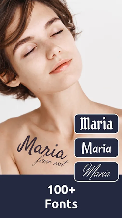 Design text with multiple tools: choose tattoo fonts, size, shadow, and color! Add your name and test it on your body! When you complete your artwork, you can save it on your phone or share it with your friends!