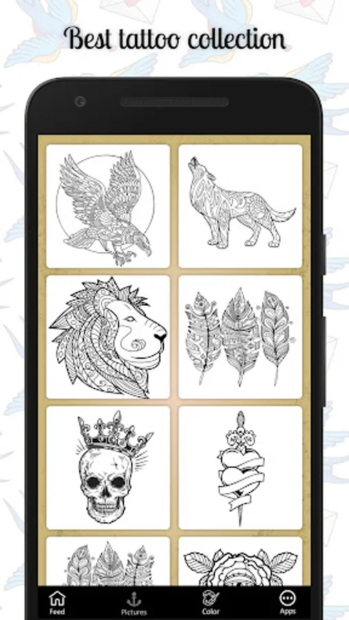 Tattoos are the stories in your heart, pictured on your skin. The color book of Tattoo Designs Drawing Coloring Book Coloring Game for adults free offline and enjoying the game. This coloring game contains hundreds of unique tattoo designs to color them.
