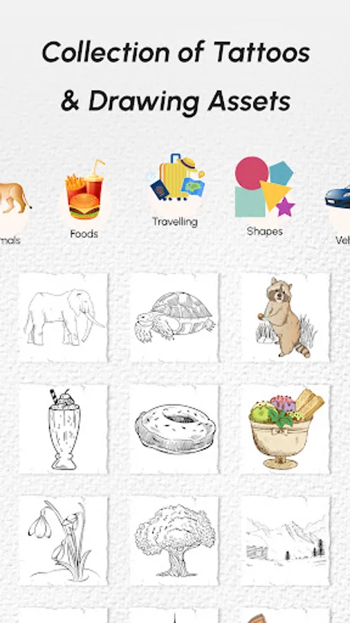 Learn tattoo drawing app includes various tattoo sketch categories. The tattoo category includes Animals, Cartoons, Fashion, Festivals, Foods, Humans, Nature, Shapes, Sports, Technology, Traveling, Vegetables, and Vehicles. You have to select the image from the category for tracing.