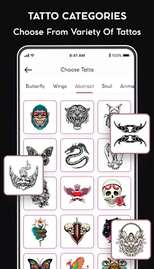 1. Extensive Tattoo Collection: The app offers a vast collection of professionally designed tattoos categorized by style, size, and theme. Users can browse through various categories and explore an extensive library of tattoos.