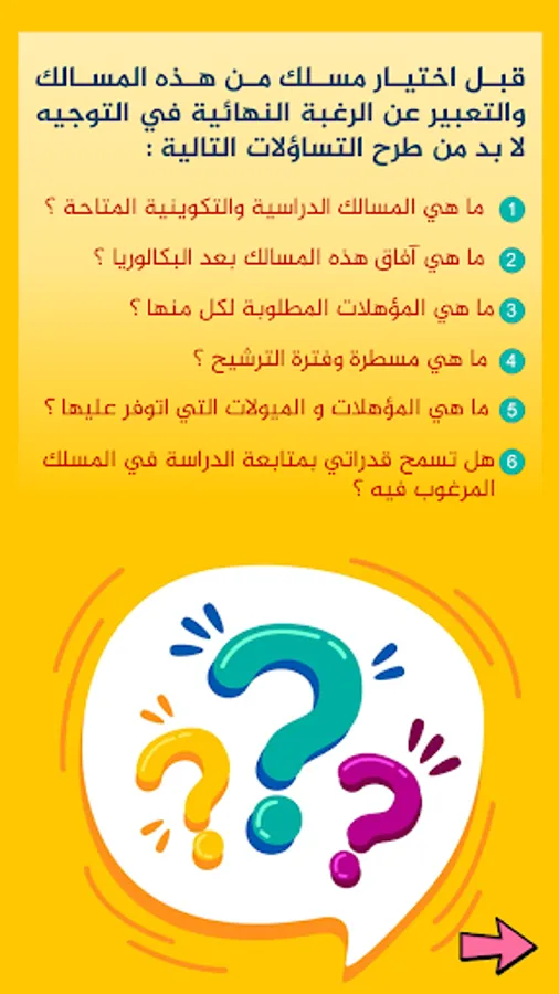 The application provides a package of information related to guidance after the preparatory year in the regular tracks (literary, scientific, technological, and original education) in order to enable students to make a conscious and responsible choice of the academic path that suits their preferences and abilities.