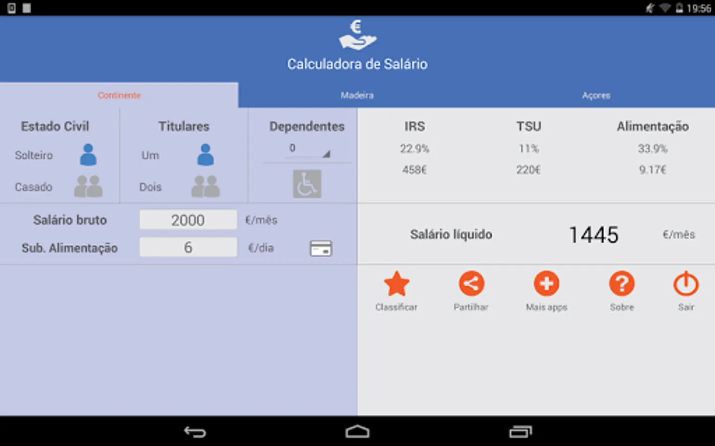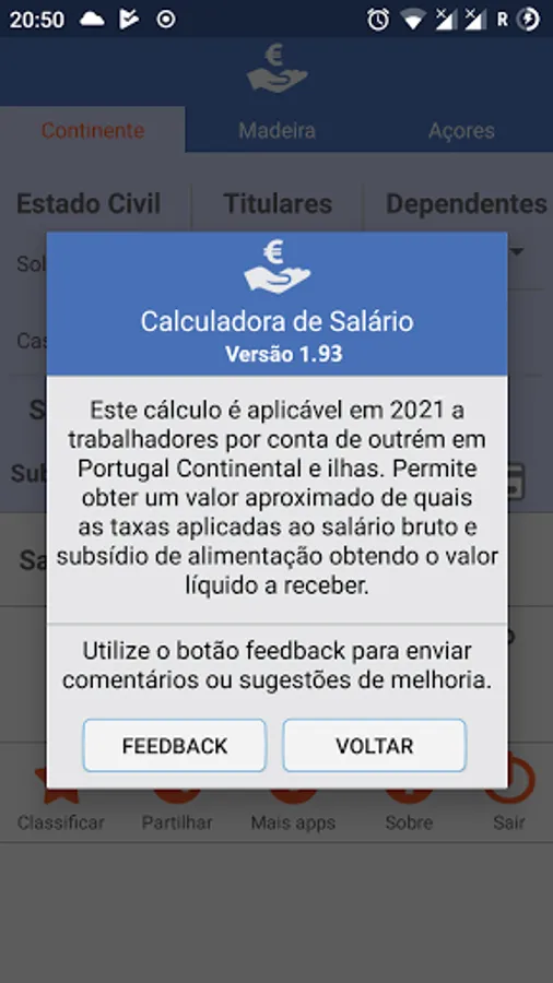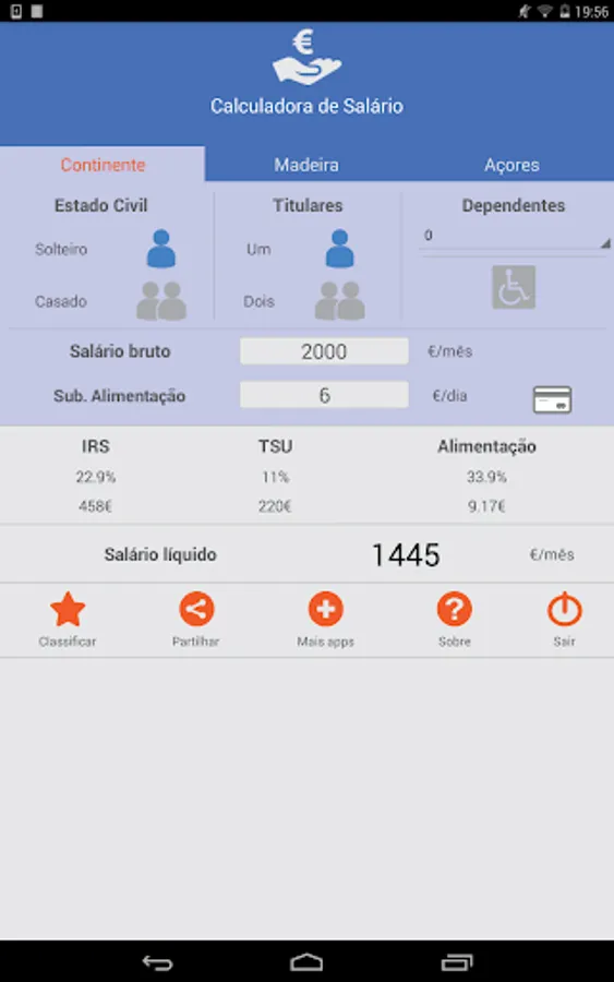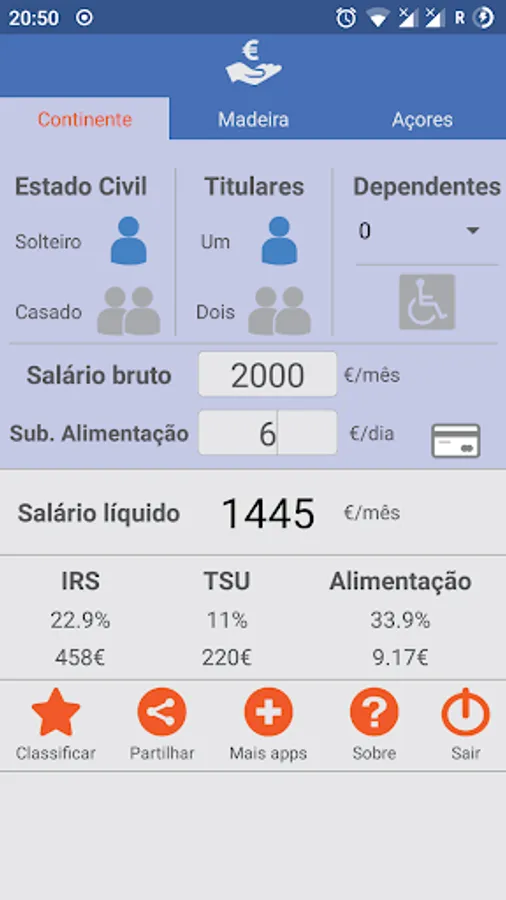 Application to calculate the net salary for the private sector in Mainland Portugal and Islands based on gross salary and food allowance, including all categories of IRS for the year 2021.