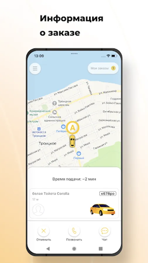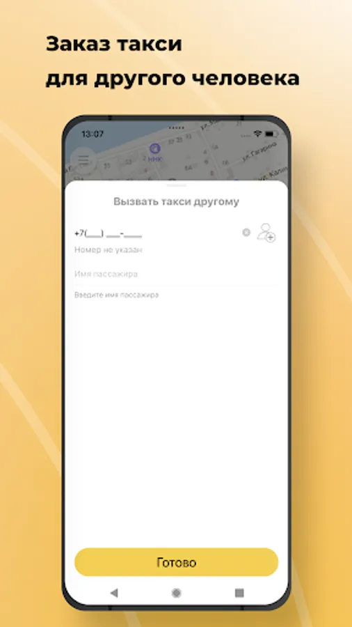 Use the option “Call a taxi for someone else” in the “Wishes” section and indicate his phone number. When the taxi arrives, an SMS will be sent to the specified number, and you will receive a message in the application.