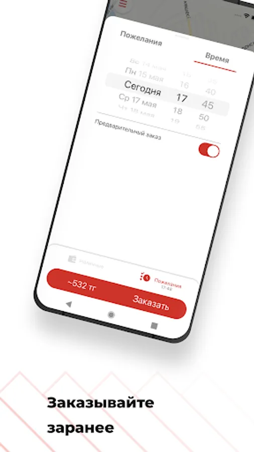 Select the "Pre-order" option. The car search will start shortly before the trip order, and the car will arrive at the appointed time. Also, you will know in advance the cost of the trip.
