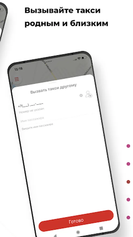 Use the option “Call a taxi for someone else” in the “Wishes” section and indicate his phone number. When the taxi arrives, an SMS will be sent to the specified number, and you will receive a message in the application.