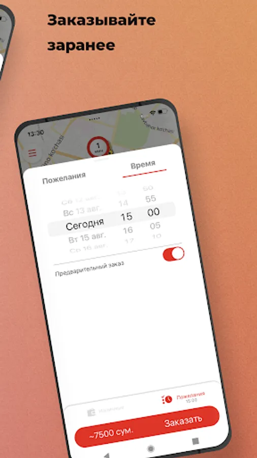 Select the “Pre-order” option. The search for a car will begin shortly before ordering a trip, and the car will arrive at the appointed time. You will also know the cost of the trip in advance.