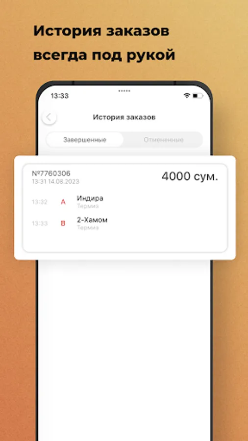 Order Online Taxi Surxondaryo in the cities of Termez, Denau, Angor, Sherabad, Jarkurgan, Uzun, Sariasia through the application. It's 3 times faster than over the phone! There is a couple of seconds between the desire to get to the right place and the search for a car.
