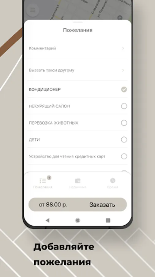 Please add additional requests to your order. For example, when it's +35 outside - select "air conditioning". If you cannot stand the smell of tobacco, select "Non-smoking salon", and a non-smoking driver will come to you.