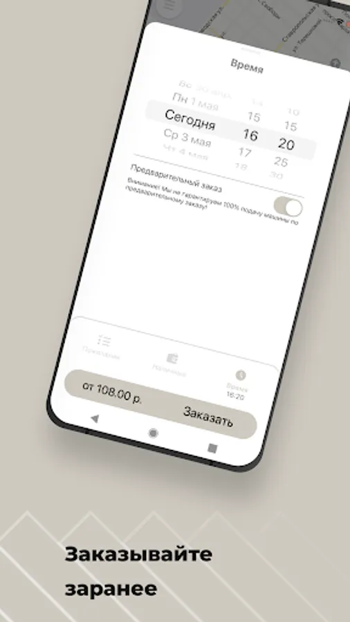 Select the "Pre-order" option. The car search will start shortly before the trip order, and the car will arrive at the appointed time. Also, you will know in advance the cost of the trip.