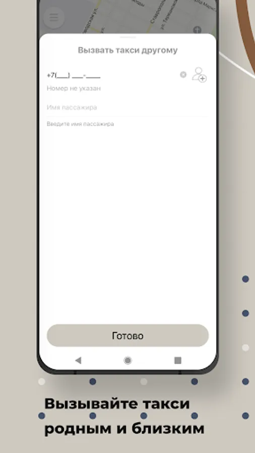 Use the option “Call a taxi for someone else” in the “Wishes” section and indicate his phone number. When the taxi arrives, an SMS will be sent to the specified number, and you will receive a message in the application.