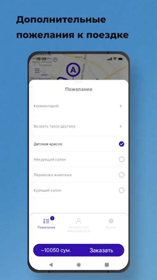 Please add additional requests to your order. For example, when it's +35 outside - select "air conditioning". If you cannot stand the smell of tobacco, select "Non-smoking salon", and a non-smoking driver will come to you.
