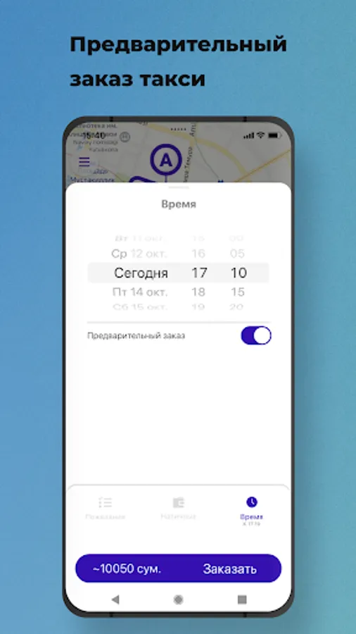 Select the "Pre-order" option. The car search will start shortly before the trip order, and the car will arrive at the appointed time. Also, you will know in advance the cost of the trip.