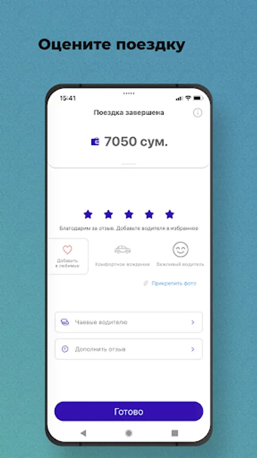 Rate the driver, write a review, or select a reaction from ready-made templates. Attach a photo to a review, leave a tip, or view payment details after your trip.