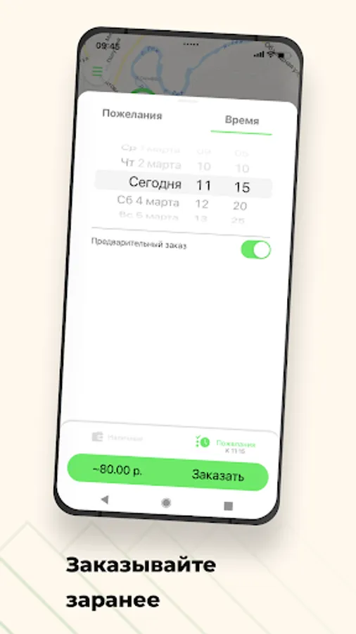 Need a car by a specific time and date? Order it in advance through the application, and at the appointed time, a taxi will be waiting for you at the entrance.