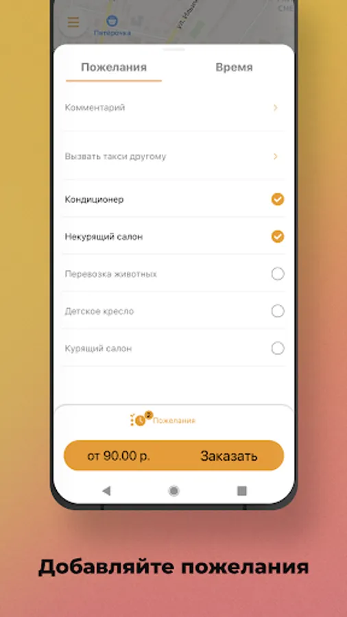 Please add additional requests to your order. For example, when it's +35 outside - select "air conditioning". If you cannot stand the smell of tobacco, select "Non-smoking salon", and a non-smoking driver will come to you.