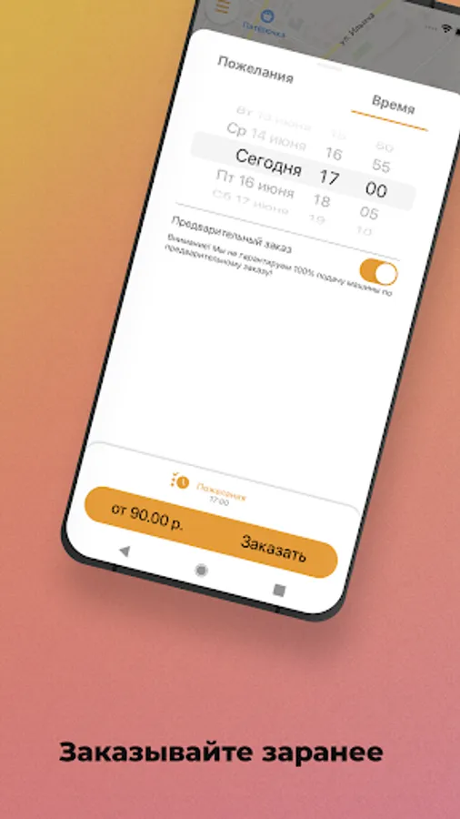Select the "Pre-order" option. The car search will start shortly before the trip order, and the car will arrive at the appointed time. Also, you will know in advance the cost of the trip.
