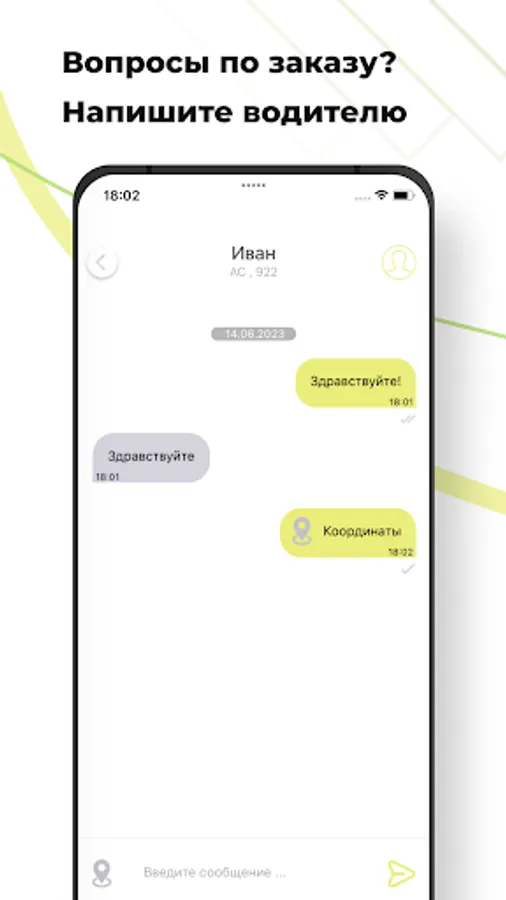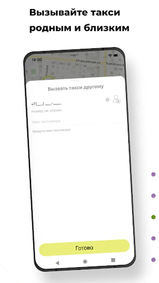 Use the option “Call a taxi for someone else” in the “Wishes” section and indicate his phone number. When the taxi arrives, an SMS will be sent to the specified number, and you will receive a message in the application.