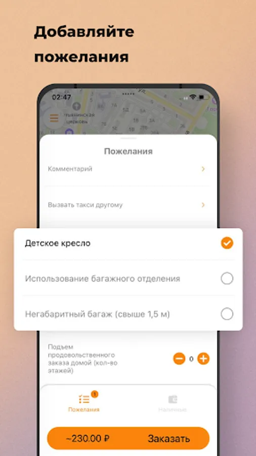 Add additional wishes to your order. For example, if you have a lot of packages with you, select “use luggage compartment”. If a child is traveling with you, indicate “child seat.”