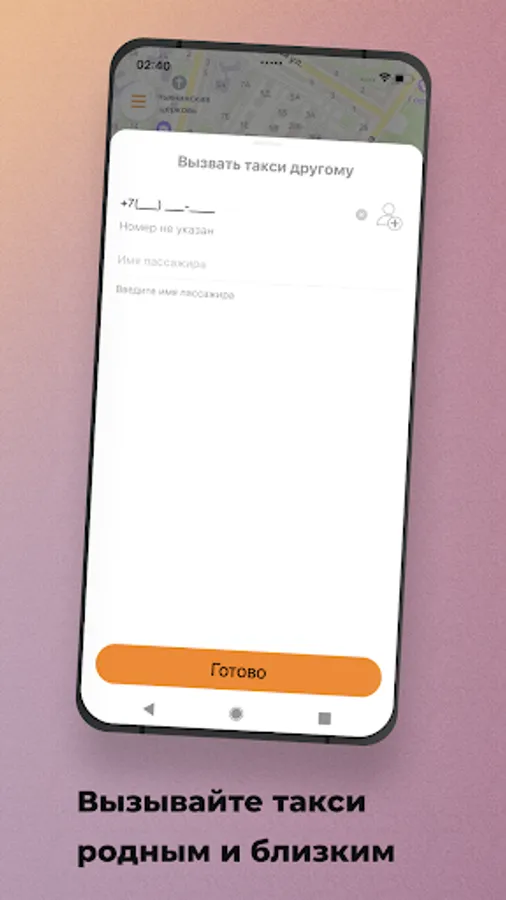 Use the “Call a taxi for someone else” option in the “Wishes” section and indicate his phone number. When the taxi arrives, an SMS will be sent to the specified number, and you will receive a message in the application.
