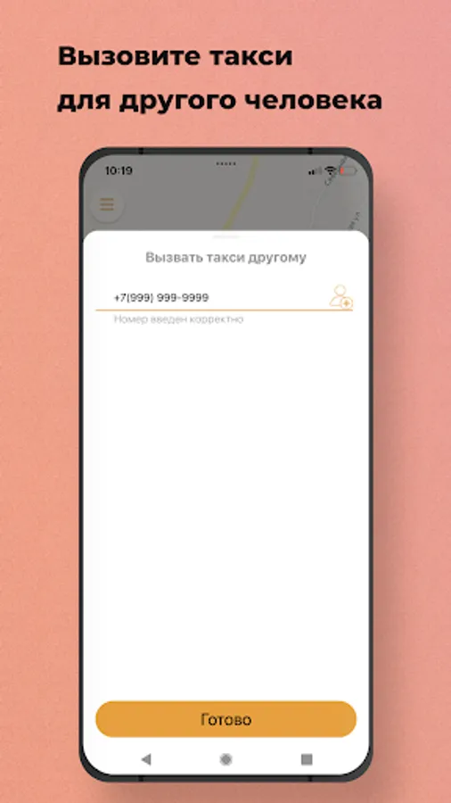 Use the option “Call a taxi for someone else” in the “Wishes” section and indicate his phone number. When the taxi arrives, an SMS will be sent to the specified number, and you will receive a message in the application.