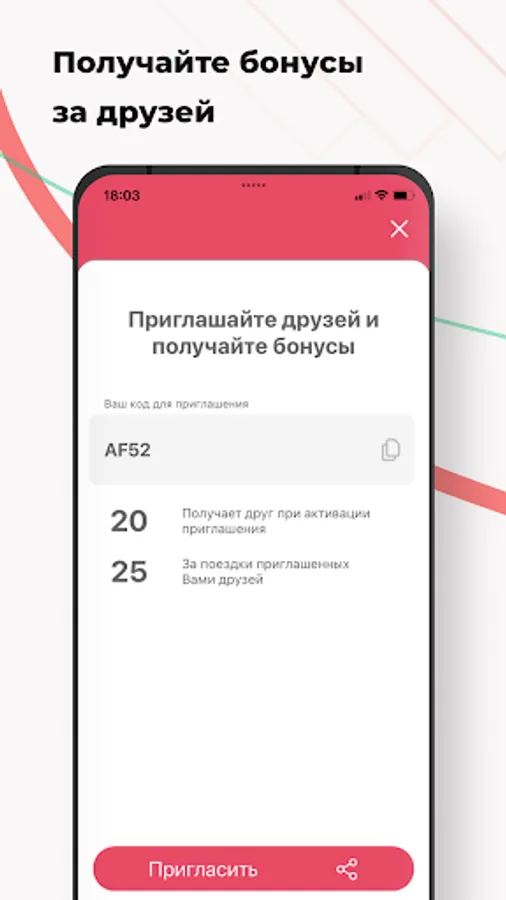 Invite friends with a referral code and get bonuses for their trips. Use bonuses to pay for trips.