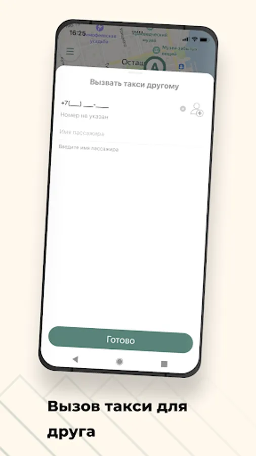 Use the option “Call a taxi for someone else” in the “Wishes” section and indicate his phone number. When the taxi arrives, an SMS will be sent to the specified number, and you will receive a message in the application.
