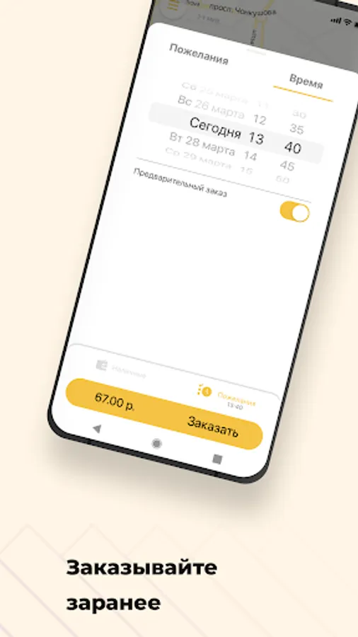 Select the "Pre-order" option. The car search will start shortly before the trip order, and the car will arrive at the appointed time. Also, you will know in advance the cost of the trip.