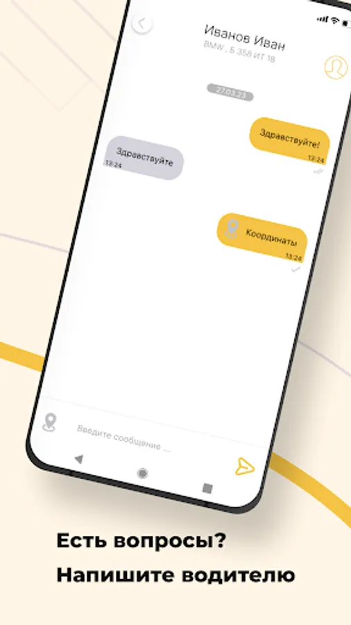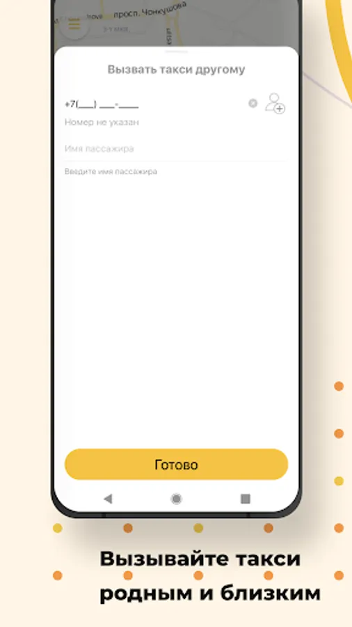Use the option “Call a taxi for someone else” in the “Wishes” section and indicate his phone number. When the taxi arrives, an SMS will be sent to the specified number, and you will receive a message in the application.