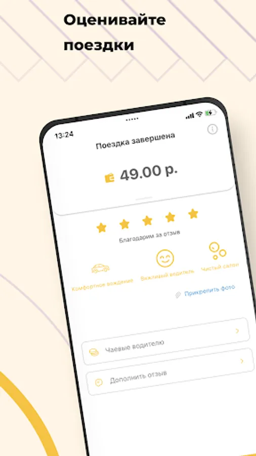 Rate the driver, write a review, or select a reaction from ready-made templates. Attach a photo to a review or leave a tip if you enjoyed the trip.