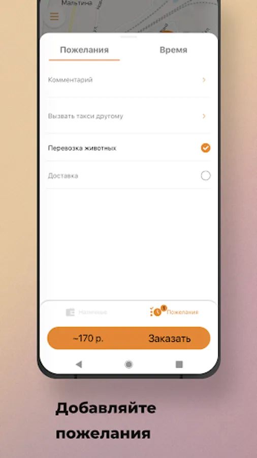 Use the option “Call a taxi for someone else” in the “Wishes” section and indicate his phone number. When the taxi arrives, an SMS will be sent to the specified number, and you will receive a message in the application.