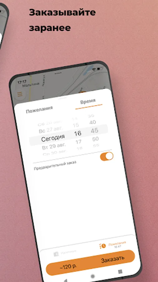 Need a car by a specific time and date? Order it in advance through the application, and at the appointed time, a taxi will be waiting for you at the entrance.