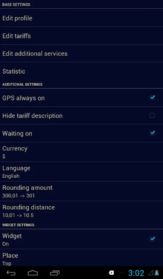 Adjust accuracy and rounding. You can set up rounding counting mileage, time and sum, and you can quickly remove a penny. With rounded you can even set for an hourly and hourly accounting - every incomplete kilometer or hour will be counted as complete. If the GPS reception is not accurate, you can turn on the GPS filter. Select a currency from several preset or set your own icon. The distances are measured in kilometers and miles.