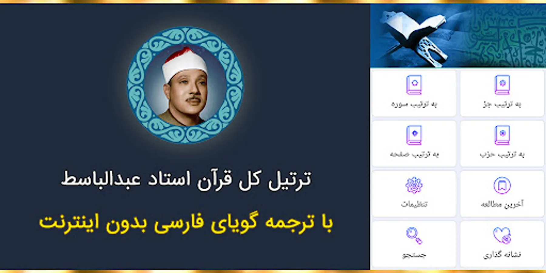 ✤ Reciting the entire Quran with the voice of Professor Abdul Basit Muhammad Abdul Samad with a Persian speaking translation separated by surah, page, part and party without the need for the Internet✤
