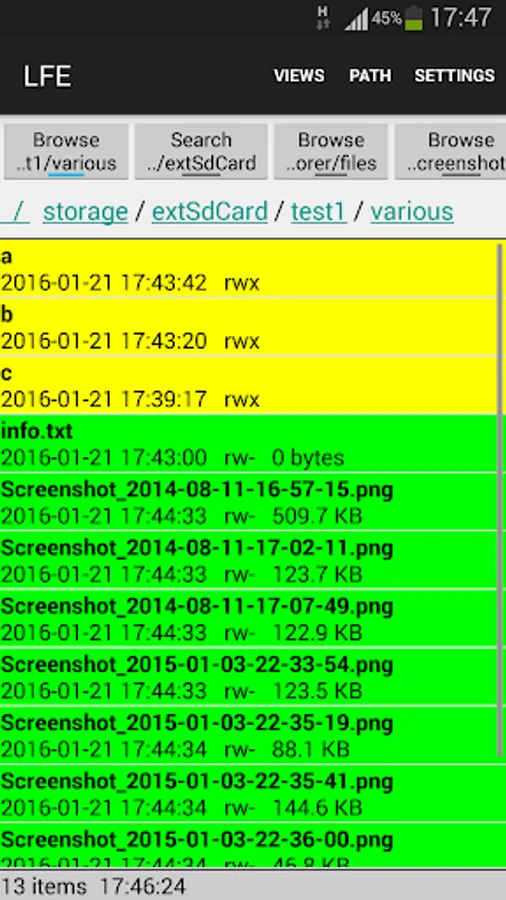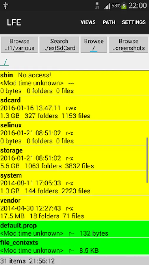 Light File Explorer (LFE) is a file manager app. It shows files and folders at their actual location path starting at "/".